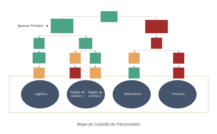 Analisar o comprometimento e alinhamento dos patrocinadores em toda a organização ajuda você e seu patrocinador primário a impulsionar os elementos de Awareness, Desire e Reinforcement do modelo ADKAR. Diagramar isso em um organograma permite visualizar o nível de suporte que você tem para uma mudança em cada área do negócio, analisar a saúde geral da coalizão, identificar as ações necessárias e identificar os riscos para seu esforço de mudança.