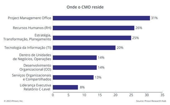 Os participantes do estudo relataram uma mudança notável na localização do escritório de Gestão de Mudanças. Pela primeira vez na história da pesquisa da Prosci, o local mais comum para o Escritório de Gestão de Mudanças (CMO) é o Escritório de Gestão de Projetos (PMO) em vez de Recursos Humanos (RH).
