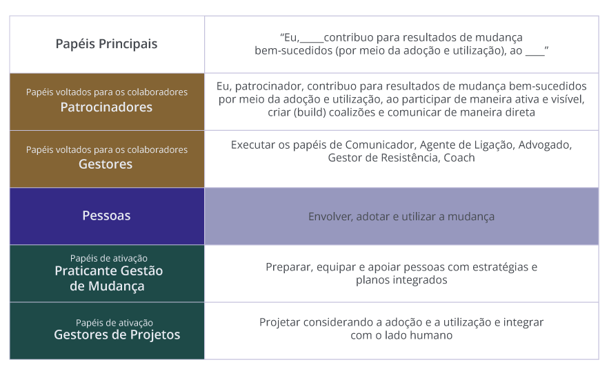 É preciso todo um sistema de pessoas na organização para apoiar a transição do estado atual para o estado futuro desejado. Para garantir o suporte necessário, as equipes de gestão de mudanças precisam de indivíduos específicos para cumprir os papéis principais formais na gestão de mudanças abaixo.