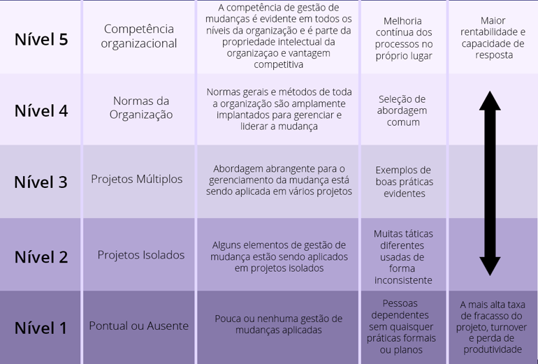 Observe que os cinco níveis do modelo de maturidade acima são os resultados potenciais que uma organização pode alcançar quando aumentar a capacidade de Gestão de Mudanças Organizacionais. Os níveis são sequenciais, cumulativos, incrementais e o progresso pode variar de acordo com cada empresa. Por exemplo, sua organização pode estar no nível 1.2 hoje e trabalhar em direção à um estado futuro desejado de 3.9 em três anos, enquanto uma organização menor pode precisar de um cronograma mais longo para trabalhar uma meta semelhante.