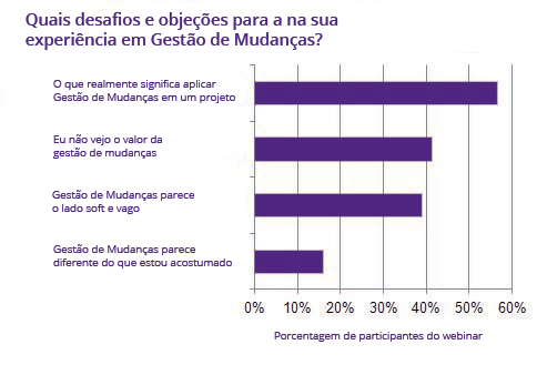 O business case é um veículo poderoso para apresentar a lógica e a abordagem da Gestão de Mudanças, pois ajuda a resolver algumas das objeções ou desafios mais comuns. Em um webinar sobre o assunto, os participantes comentaram sobre os desafios ou objeções mais comumente enfrentados pela Gestão de Mudanças. Abaixo estão as principais respostas: