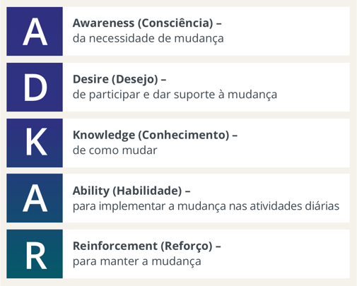 O Modelo Prosci ADKAR fornece aos agentes de mudança um roteiro claro para apoiar as pessoas durante o processo de mudança. Os agentes de mudança podem ser particularmente úteis na construção da Consciência e do Desejo - os dois primeiros elementos do Modelo ADKAR - que são cruciais para que os indivíduos adotem a mudança.