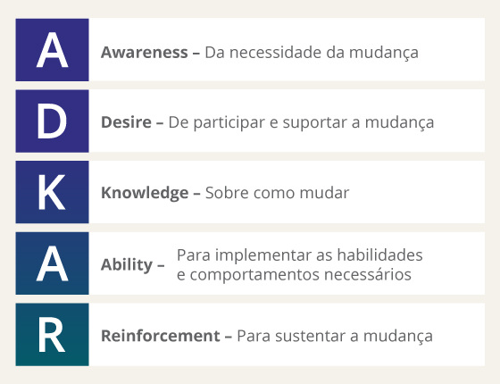 Essas perguntas comuns fazem parte da conscientização da necessidade de mudança. Esse é o primeiro elemento do Modelo ADKAR da Prosci, uma estrutura para facilitar a mudança. O modelo baseia-se no entendimento de que a mudança organizacional só pode ocorrer quando os indivíduos mudam.