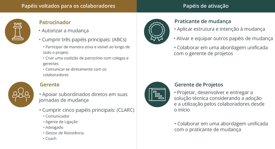 Na disciplina de gestão de mudanças, fazemos a distinção entre papéis voltados para o colaborador e papéis de ativação, e como elas trabalham juntos como um sistema para apoiar as pessoas durante a mudança. Os papéis de ativação incluem praticantes de gestão de mudança e gestores de projeto que aplicam estrutura à mudança, projetam e desenvolvem a solução e conduzem outras atividades que ativam os papéis voltados para os colaboradores para o sucesso. Os papéis voltados para os colaboradores são os patrocinadores executivos e gestores de pessoas que aproveitam o ABC e o CLARC para levar adiante as mudanças do projeto.