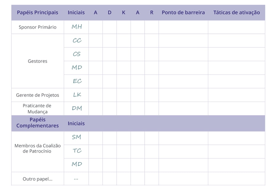 A lista também pode depender de quanto tempo os papéis precisam dedicar em vários estágios do projeto. Um papel de gestão de projeto ou o papel do “lado técnico” terá mais trabalho durante o planejamento e o início do projeto, mas as atividades deles podem diminuir mais tarde à medida que você implementa a mudança, se aproxima do go-live, começa a reforçar comportamentos e sustenta os resultados da mudança.