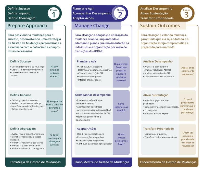 Embora o ADKAR possibilite mudanças individuais, nosso processo flexível de três fases permite que você o dimensione em nível organizacional e o alinhe às metas da organização. As fases tratam das atividades que os profissionais de gestão de mudanças realizam junto com as equipes de projeto para definir o sucesso e implementar uma abordagem abrangente. Como resultado, todos sabem o que estão tentando alcançar, quem a mudança afeta e o tipo de atividades necessárias para obter uma mudança bem-sucedida.
