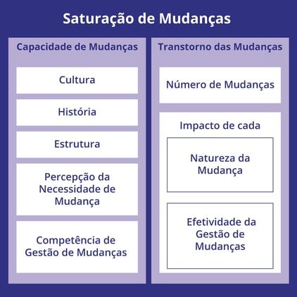 Se não for tratada, a saturação de mudanças pode reduzir os recursos que você tem para implementar sua mudança, o que resultará em resultados menores ou até mesmo em projetos fracassados. Como praticante em Gestão de Mudanças, a realidade de saturação de mudanças significa que você precisa considerar se sua organização está pronta para outra mudança, bem como quais outras mudanças já estão em andamento.