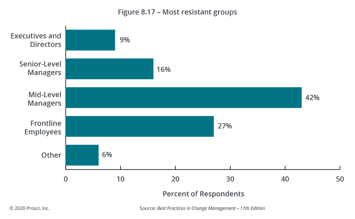 Na Pesquisa de Melhores Práticas em Gestão de Mudanças da Prosci, os participantes identificaram os grupos nos quais eles experimentaram mais resistência. Os gerentes de nível médio foram o grupo mais resistente, seguidos pelos colaboradores. Esses dados ou essas descobertas são consistentes com estudos anteriores.