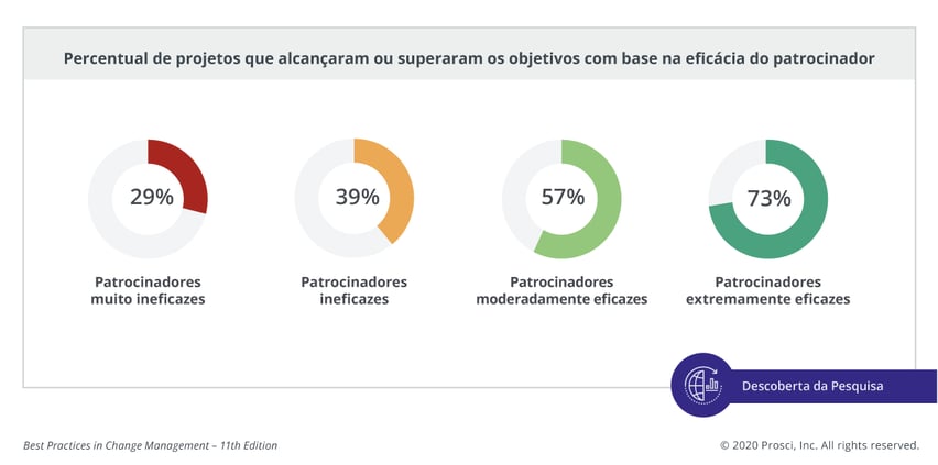 Este é o maior obstáculo relatado pelos participantes. Assim como em estudos anteriores, isso revela o impacto significativo que o patrocínio pode ter no trabalho de Gestão de Mudanças. Da mesma forma que um patrocínio eficaz pode mobilizar e ativar uma organização, um patrocínio ruim pode inibir e retardar o progresso. Os colaboradores interpretam o fato de um patrocinador ser ausente ou inativo como uma indicação de quão importante ou sem importância é a iniciativa.