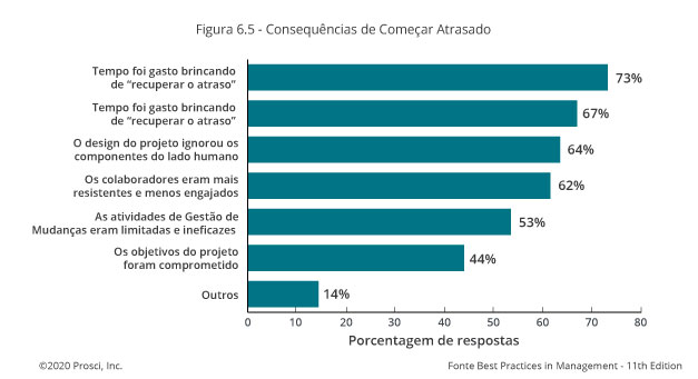 As atividades de gestão de mudanças devem começar durante a fase de iniciação do projeto. Infelizmente, nem sempre é isso que acontece no mundo real. Algumas organizações só prestam atenção a gestão de mudanças quando surgem problemas como resistência significativa e baixa adoção do usuário, geralmente quando o projeto está em andamento. A pesquisa da Prosci mostra que gestão de mudanças, mesmo que iniciada tarde, pode ter um impacto positivo na obtenção dos resultados desejados de uma mudança. Nesses casos, alguma gestão de mudanças pode ser melhor do que nenhuma.