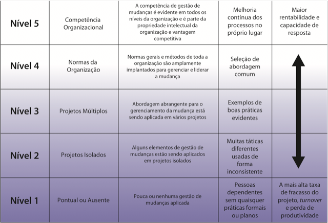 Nível 5 é ter competência de Gestão de Mudanças como parte do conjunto de habilidades da organização.