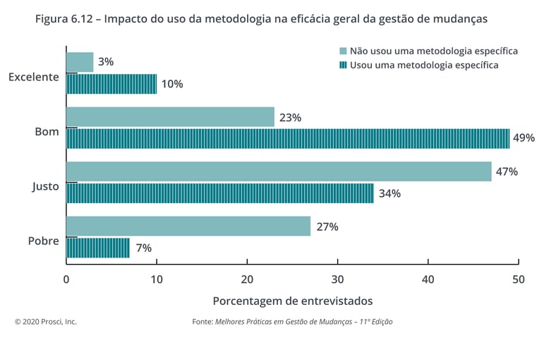 Como as organizações usam uma abordagem estruturada foi bastante variável. 76% usaram uma metodologia de Gestão de Mudanças para orientação global, enquanto 48% usaram como um checklist de atividades e 39% usaram para monitorar o progresso (os participantes puderam selecionar respostas múltiplas, resultaram em um total de mais de 100%). Mais uma vez, a pesquisa revelou o quanto a aplicação de uma abordagem estruturada contribuiu para o sucesso. Os participantes que aplicam uma abordagem estruturada tiveram 33% mais probabilidade de experimentar uma boa ou excelente eficácia na Gestão de Mudanças do que aqueles sem uma metodologia.