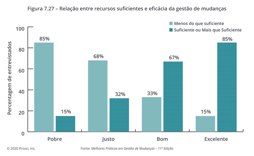 Um participante da pesquisa forneceu este comentário perspicaz: “Se não é o trabalho de alguém, então não é o trabalho de ninguém”. Para perceber os benefícios da gestão de mudanças, alguém deve ser responsável por ela e ter acesso a uma quantia adequada de financiamento. Os dados revelam uma correlação positiva e significativa entre ter um recurso dedicado (pessoa) e a eficácia geral da gestão de mudanças. Os participantes que tinham recursos dedicados eram significativamente mais propensos a alcançar uma eficácia boa ou excelente na gestão de mudanças do que aqueles sem um recurso dedicado.