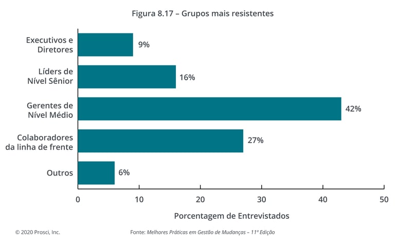 O estudo mais recente revela que os gerentes intermediários são o grupo mais resistente à mudança, com 42% dos participantes identificando-os como tal. Os participantes acreditam que a maioria dessa resistência poderia ter sido mitigada abordando esse grupo cuidadosamente no plano de mudança.
