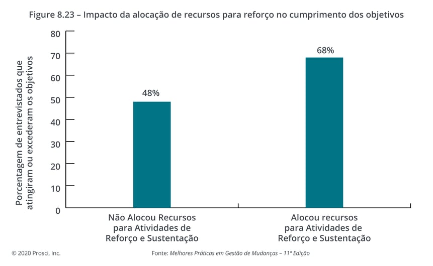 O reforço é uma etapa crítica no processo de gestão de mudanças. Como a maioria das organizações está saturada de mudanças hoje, e os profissionais devem conciliar muitas mudanças simultaneamente, eles geralmente negligenciam essa etapa. Abordar inadequadamente as atividades de reforço e sustentação tem um impacto negativo no resultado geral da mudança. Os participantes que planejaram atividades de reforço tiveram 20% mais chances de atingir os objetivos do projeto do que aqueles que não o fizeram.