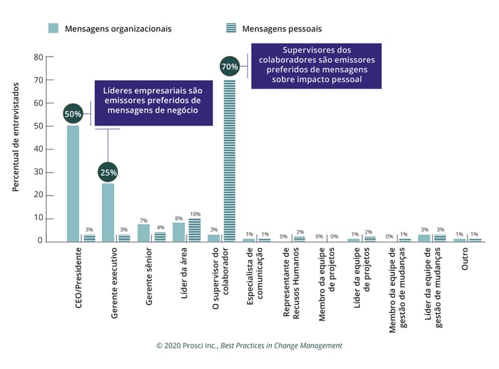 A pesquisa de Melhores Práticas em Gestão de Mudanças da Prosci mostra consistentemente que pessoas e grupos têm preferências sobre de quem eles querem ouvir durante a mudança. Você pode se surpreender ao saber que eles não querem ouvir sobre mudanças no projeto da equipe do projeto. Em vez disso, eles preferem receber mensagens específicas da pessoa responsável e de seu supervisor direto.