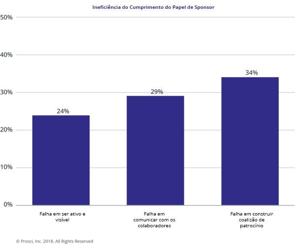 Embora essas três ações sejam críticas para o sucesso de qualquer esforço de mudança, na realidade, muitos executivos e patrocinadores não estão cumprindo essas funções com eficiência. A figura abaixo mostra a porcentagem de participantes que afirmaram que seus patrocinadores foram extremamente ineficazes. O papel que os executivos mais lutam é construir uma coalizão de patrocinadores.