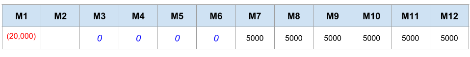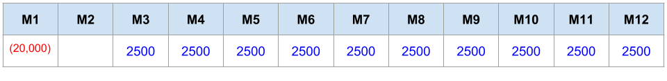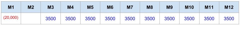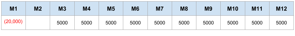 A tabela abaixo mostra um investimento de R$ 20.000,00 no mês 1 (M1) e R$ 5.000,00 do mês 3 ao mês 12.
