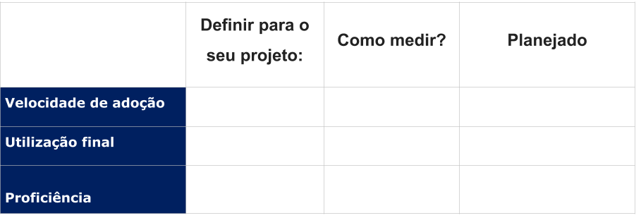 Tente aplicar os três fatores do lado humano em um projeto que você está apoiando atualmente usando a tabela abaixo. O primeiro passo para mostrar como os fatores do lado humano afetam o ROI é defini-los. Não existe uma métrica universal para a velocidade de adoção, pois “adotar a mudança” para uma iniciativa pode significar algo muito diferente se comparado a outra iniciativa. Da mesma forma, “ser proficiente” em seguir um novo processo é muito diferente de “ser proficiente” em usar uma nova tecnologia. Então, você precisa traduzir a velocidade de adoção, a utilização final e a proficiência para, especificamente, o que eles significam para o seu projeto.
