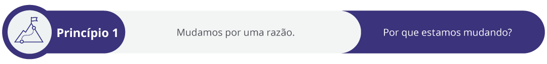 Como ponto de ancoragem para iniciar uma discussão, devemos concordar que mudamos por um motivo. Por mais simples que pareça, um princípio fundamental para gerenciar a mudança é que um estado futuro diferente pode ser imaginado, e estamos mudando para esse estado futuro para alcançar um resultado específico e desejado. Quando dizemos que mudamos por um motivo, isso não significa que o motivo de cada mudança é o mesmo, apenas que existe um motivo ou objetivo específico para ela. Os motivos para a mudança podem variar muito, como crescimento de receita, maior satisfação do cliente, redução de custos, melhor qualidade do produto ou serviço, redução de exposição ao risco, melhoria da qualidade de vida, etc.