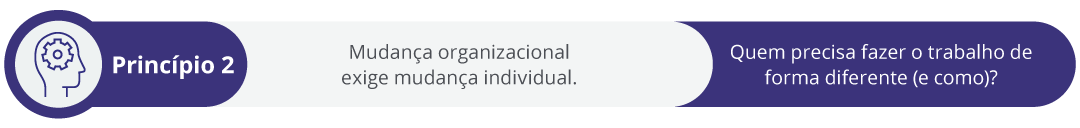 A mudança só ocorre quando os indivíduos na organização começam a trabalhar de novas maneiras: exibindo novos comportamentos, usando novas ferramentas, aderindo a novos processos e adotando novos valores. Mudanças individuais de comportamento são a pedra angular de uma mudança. Em conjunto, várias mudanças individuais como essas permitem que a organização atinja o estado futuro desejado. A mudança organizacional resulta da adoção de novas habilidades pelas pessoas e da demonstração de novas capacidades. Embora isso pareça senso comum, muitas vezes presumimos erroneamente que a mudança em um nível individual acontecerá por si mesma.