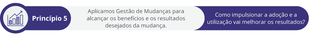 Alcançar resultados de projetos e iniciativas exige mais do que comunicações e treinamento. Ao ajudar os colaboradores a fazerem suas transições individuais, você obtém resultados mais eficazes e o faz mais rapidamente. Maior adoção e uso, pessoas mais satisfeitas, maior ROI do projeto e maior agilidade organizacional podem ser sua realidade. E começa com a compreensão dos cinco princípios básicos da Gestão de Mudanças.