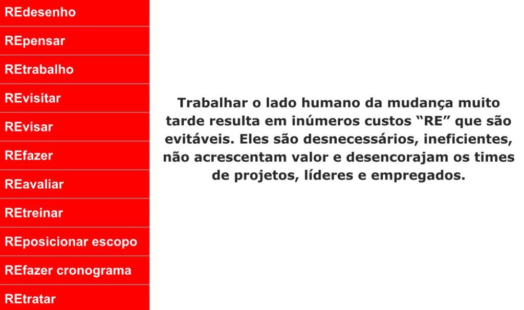 Abaixo estão alguns dispendiosos “RE” que resultam em abordar o lado humano da mudança tarde demais. Pense na sua experiência trabalhando em projetos e iniciativas. Você já experimentou algum dos custos “RE”? Os custos poderiam ter sido evitados se o lado humano da mudança fosse tratado anteriormente no ciclo de vida do projeto?