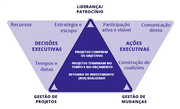O modelo Prosci PCT ™ (Project Change Triangle) demonstra os três elementos que todo projeto precisa para ter sucesso: liderança / patrocínio, Gestão de Projetos e Gestão de Mudanças.
