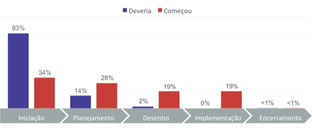 O Relatório da Pesquisa de Melhores Práticas em Gestão de Mudanças da Prosci – Edição de 2018, mostra quando os participantes iniciaram a Gestão de Mudanças e quando deveriam iniciá-la da próxima vez:
