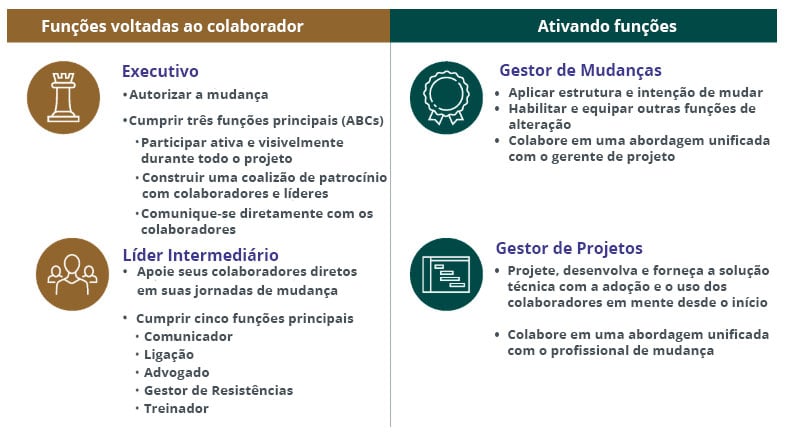 Na disciplina de Gestão de Mudanças, fazemos a distinção entre as funções voltadas para colaboradores e as que cuidam da estratégia. Além disso, a forma que elas funcionam juntas, como um sistema para apoiar as pessoas através da mudança. As funções de habilitação incluem profissionais de mudança e gerentes de projetos que aplicam estrutura à mudança, projetam e desenvolvem a solução e conduzem outras atividades que configuram as funções voltadas para os colaboradores para o sucesso. Essas funções voltadas para os colaboradores são os executivos/patrocinadores e os gerentes de pessoas que utilizam os ABCs e o CLARC para avançar as mudanças no projeto.