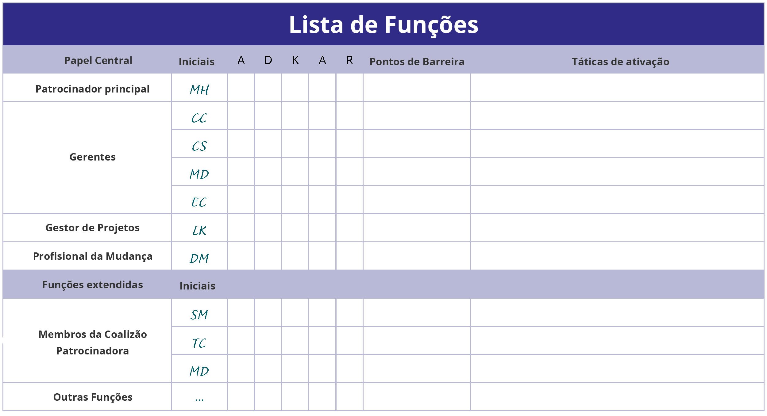 Como praticante de mudanças, você pode ajudar as pessoas a desempenhar ativamente suas funções para garantir o sucesso da mudança. A criação de uma lista de papéis bem projetada pode fornecer clareza além de concentrar a atenção nos resultados de adoção e uso de cada função, melhorando a sua eficácia e eficiência como praticante de mudanças.