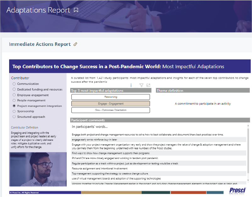 Pronto para explorar as adaptações? Clique no link abaixo para acessar o relatório interativo da Prosci sobre as Os Principais Fatores para o Sucesso da Mudança em um Mundo Pós-pandemia. É apenas um dos relatórios que compõem o estudo completo. Examine os dados do seu jeito, alternando entre os sete principais colaboradores e as três principais adaptações mais impactantes para revelar os comentários dos participantes correspondentes.