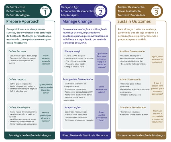 Essa abordagem, apoiada pela Metodologia Prosci, garante que as iniciativas de mudança sejam bem executadas e, idealmente, estejam em sintonia com as metas estratégicas exclusivas de cada setor.