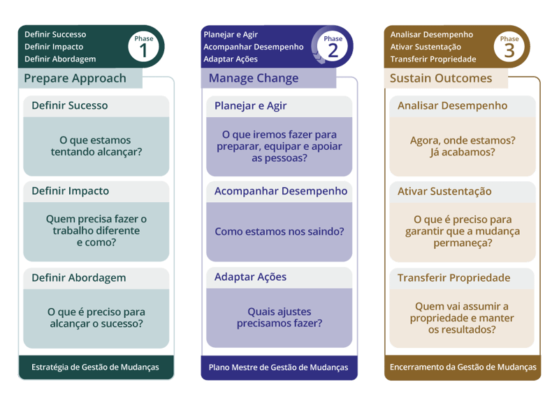 Na Fase 3 - Sustentar os resultados, você continua a medir os resultados do ADKAR para garantir que a mudança seja reforçada em nível individual, para que ela "se mantenha".