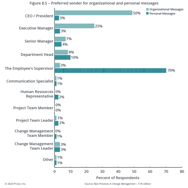 For example, research shows that employees prefer to receive organizational messages about change from leaders at the top of their organization and messages about the change's impact on their day-to-day work from their immediate supervisor.