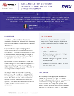 Avnet Inc. is a global distributor of electronic components, enterprise IT and embedded technology with 15,000+ employees doing business in more than 300 countries. Initially, Avnet partnered with Prosci to simply add change management to its Organizational Excellence department. Change management would be an add-on to people’s work—a go-to tool and enabler for executing continuous improvement.