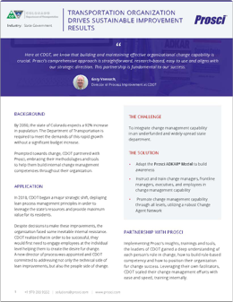 During initial consultations, they identified customer service and organizational efficiency as key areas for improved performance, and put large enterprise changes in place. Due to the dispersed nature of the organization and unique needs, CDOT also purchased a Prosci ECM License. This allowed CDOT to positively impact more targeted groups affected by change, while meeting their need for increased flexibility and reduced training costs.