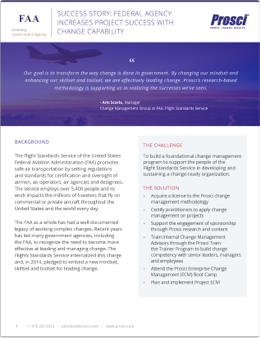 To build competency, these CMAs make sure that the organization is teaching Prosci’s change management courses to the right groups, at the right times, and with the right instructors. They also help the FAA training division effectively integrate change management content into existing training curriculum. The CMAs are assigned to specific executive and senior leaders, working closely with them to continue building their personal competency to lead change.