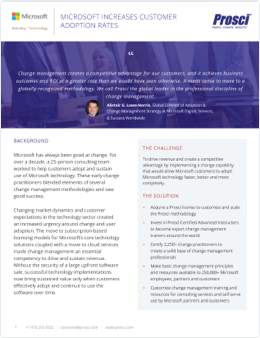 We chose Prosci for a number of additional reasons. First, Prosci has a comprehensive set of intellectual property (IP). Second, the Prosci methodology is research-based. Twenty years of experience and research really shines in the IP. Third, Prosci came with a comprehensive set of training and readiness that we could use and customize to grow the capability. Finally, we chose Prosci because of its focus on individual change in addition to organizational change. Some methodologies are purely focused on organizational change, but Prosci has both. The focus on people at the individual level aligns with Microsoft's mission "to empower every person and every organization on the planet to achieve more."