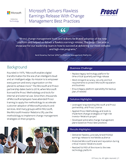 Microsoft and the IR team realized the full ROI with the move to the new platform because they focused on helping the people that were affected by the change to understand why, to know how, and to deliver on the new technology. “Prosci change management tools and skillsets facilitated adoption of the new platform and helped us deliver a flawless earnings release,” says Kent Rosema, Partner GPM for Financial Management Platforms. “This project became a showcase for our leadership team in how to succeed at delivering our most complex and high-risk programs.”