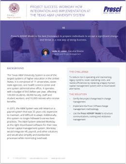 The executive director of program and project management used the Prosci Methodology to guide much of her change management work. Because the Workday implementation would impact over 58,000 end users, the project team decided to apply a formal change management approach for the first time at the A&M System. As a result, creating a repeatable template for change management on a project became one of the expected outputs of the implementation.